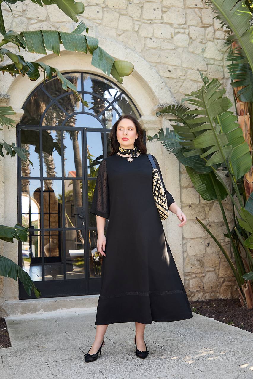 kolları tül detaylı siyah elbise