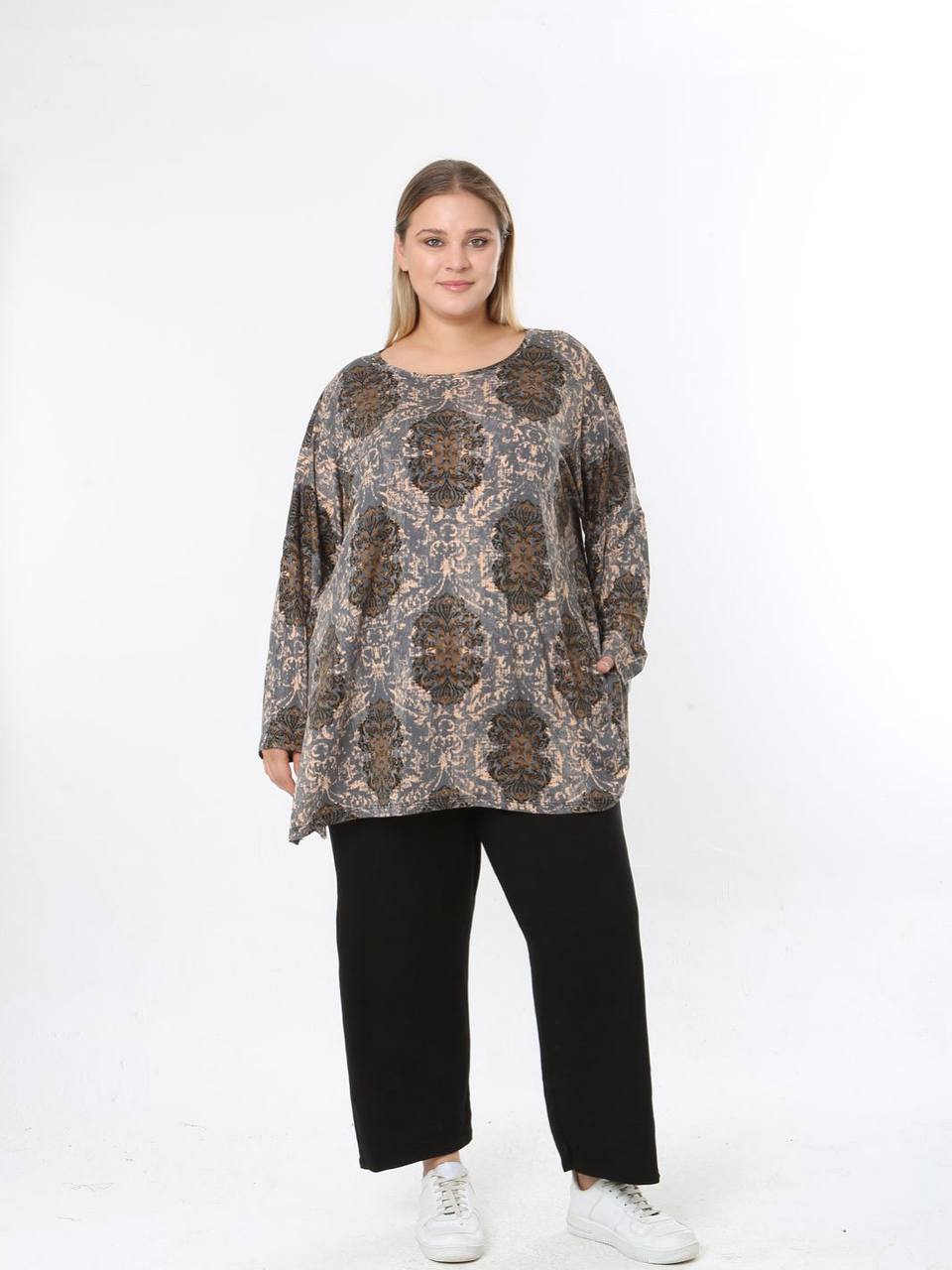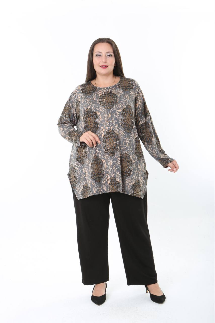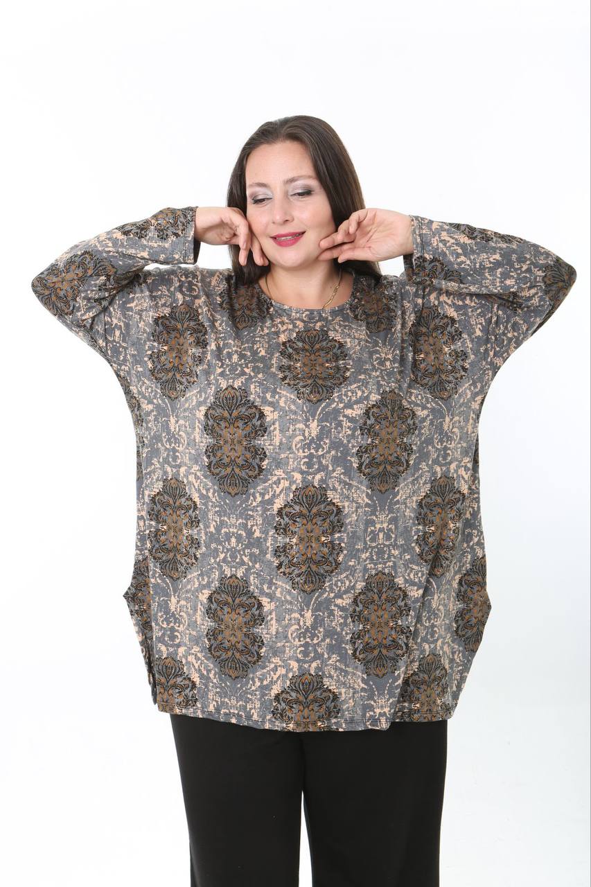 Viskon Penye kumaşından üretilen bu ilkbahar/sonbahar geçiş dönemi  bluzu, geniş kalıp tasarımı ve likralı yapısı ile gün boyu konfor sunar. Nefes alabilen yapısı sayesinde mevsim değişimleri döneminde tam aradığınız  ferahlığı sağlayacaktır. Şık ve rahat bir görünüm arayanlar için ideal bir tercih. .Standart salaş bluz 56/58 bedene kadar uyumludur